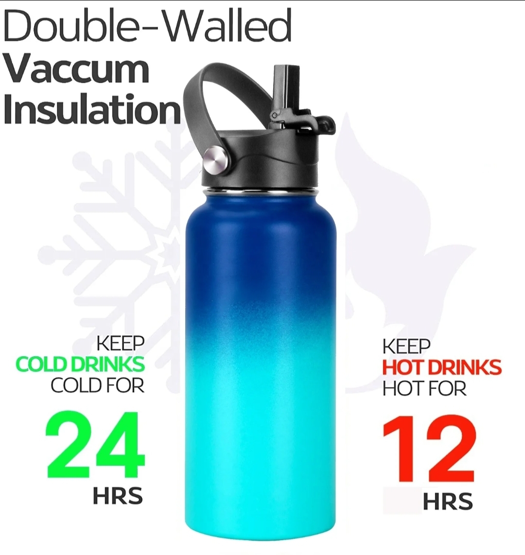 Choose to reuse with our insulated stainless steel  Water Bottles ! Keep your water or beverage cold for hours with this double wall insulated. No condensation will build up on the outside of your insulated water bottle making it comfortable to hold, with a convenient carry handle. Our large 950ml water bottles with are perfect for the gym and long days outside, office desk water bottle, Hiking, or just everyday use. This water bottle can also keep your warm beverages hot, making them ideal for camping trips and outdoor adventures.